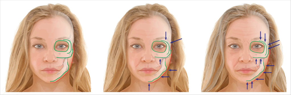 Fig. 6.6 In youth, the fat compartments of the face are congruent, resulting in a smooth appearance. Redistribution, accumulation, and atrophy of fat compartments with aging leads to facial volume loss. Some areas lose fat (forehead and cheeks), while others gain fat (mouth and jaw), resulting in contour deficiencies.