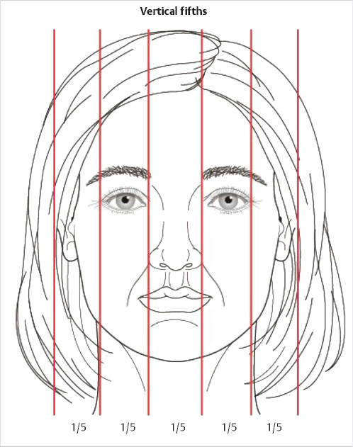 Facial width is then divided into equal fifths to evaluate balance among the parts (Fig. 6‑11). The width of one eye opening should equal one fifth of the facial width and this in turn is the width of the intercanthal distance. The lateral fifths on frontal view extend from the lateral canthus to the lateral portion of the helical rim.