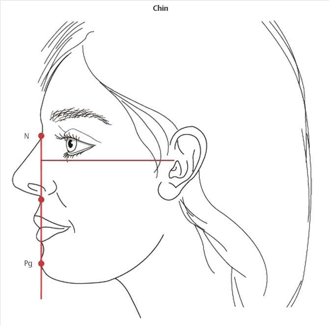 To assess the relationship of the lower face to the midface, a line is drawn from the subnasale to the pogonion perpendicular to the Frankfort horizontal line. If the pogonion is posteriorly positioned, the chin is retruding; if it is anteriorly positioned, the chin is protruding (Fig. 6‑13).