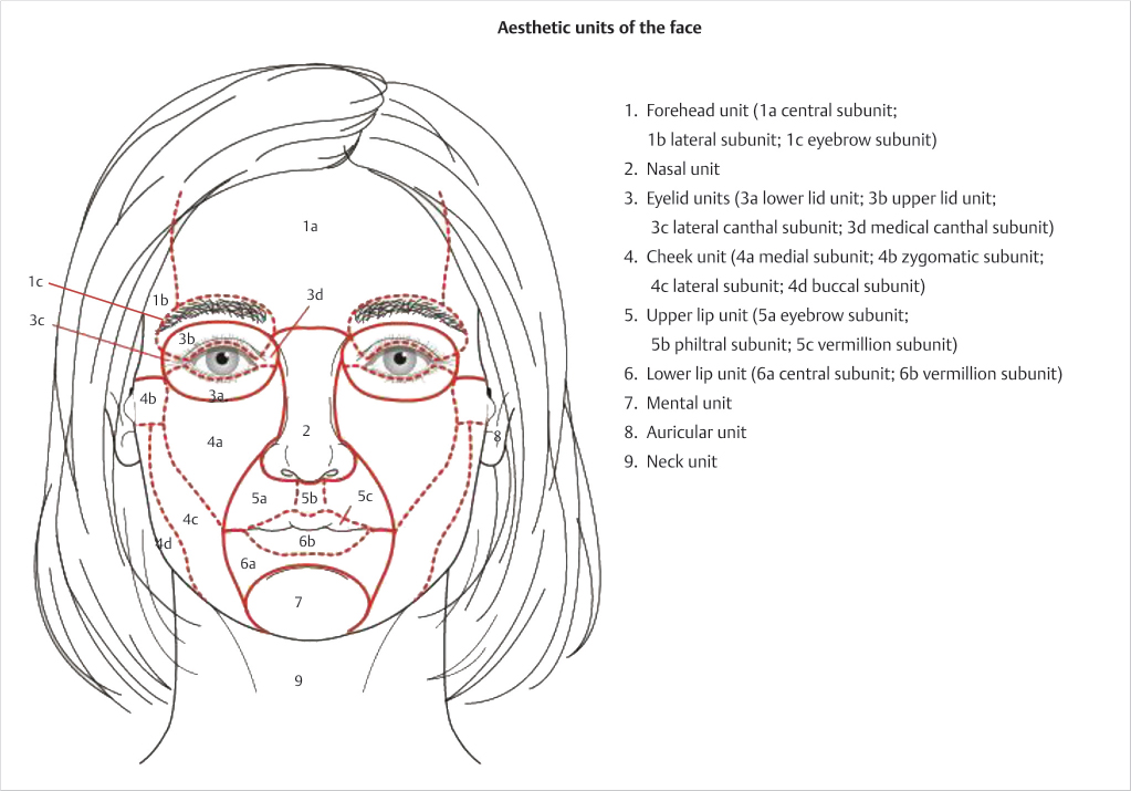 The face can be further divided into aesthetic units for further analysis: forehead, nose, eyelid, cheek, lips, chin, ears, and neck (Fig. 6‑14). The units of the face are evaluated for contour, texture, skin thickness, and color. Incisions that fall along relaxed skin tension lines and at the intersection of the aesthetic units result in the least noticeable and most favorable scars (Fig. 6‑15).