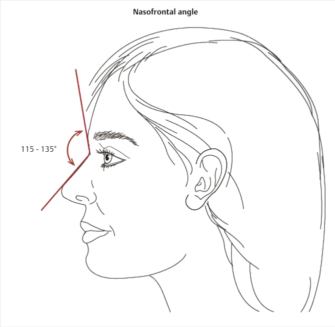 The forehead constitutes the entire upper third of the face and is convex on profile with the most anterior point above the nasion at the level of the supraorbital ridge. The boundaries of the forehead are from the frontal hairline to the glabella. In general, men have a more prominent glabellar and supraorbital rim compared to women due to larger, more aerated frontal sinuses. Women tend to have a rounder, more convex forehead. The nasofrontal angle is determined by a tangent passing through the glabella and nasion and a tangent along the nasal dorsum; this angle ranges from 115 to 135 degrees which allows for a wide variation that is gender-, ethnic- and age-related (Fig. 6‑16). The layers of the forehead and scalp region are skin, subcutaneous tissues, aponeurosis, loose areolar tissue, and periosteum, which can be remembered by the acronym SCALP. The galea aponeurosis connects the bellies of the frontalis and occipital muscles; laterally, it thins to become incorporated into the superficial temporal fascia.