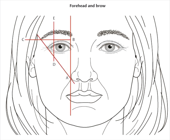 Fig. 6.16 Nasofrontal angle. Eyebrow position is shown in relation to upper lid sulcus (Line C-B), lateral canthus and ala (diagonal line started at point A), medial canthus (Line B-A) and lateral limbus (Line E-D).
