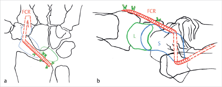 Brunelli initially described a technique to stabilize the unstable and flexed scaphoid in the setting of a scapholunate ligament (SLL) tear by passing half of a flexor carpi radialis (FCR) tendon—released proximally but anchored distally—through the axis of the scaphoid and securing it to the posterior distal radius to prevent scaphoid flexion and progression of scapholunate advanced collapse (SLAC) 1 (► Fig. 68.1). Several modifications of Brunelli’s reconstruction have been described subsequently to reconstruct the SLL in order to provide scaphoid stability while also preserving physiologic movement of the scaphoid (► Fig. 68.2).