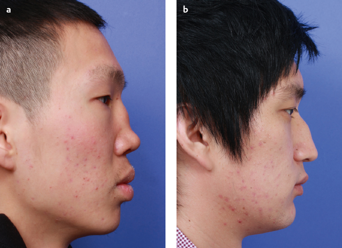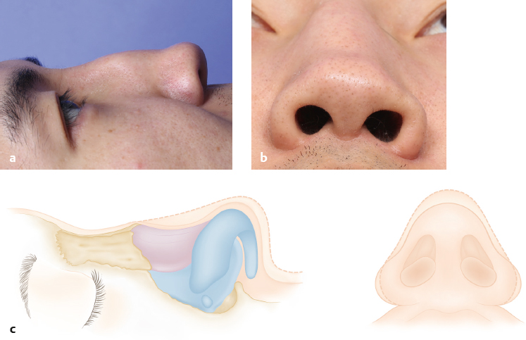 In general, saddle nose shows a broad dorsum, wide base, and inverted-V deformity in case of keystone area damage on frontal view. Lateral and oblique views reveal lower profile dorsum, saddling, retracted and short columella, low projection of the tip, and cephalic rotation in severe cases. The basal view reveals a low tip, round and flared nostrils, short columella, and wide base (Fig. 7.3). The presence of a dorsal hump that gives rise to a saddled appearance must not be confused with pseudo saddle.