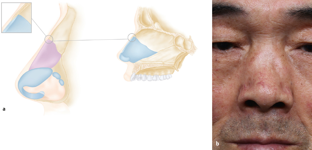The upper third is supported by the pyramid of the nasal bone. The interlocking of the quadrangular cartilage with the nasal bone forms the keystone area, which is the key area that should be preserved to prevent the collapse of the saddling of the dorsum and creation of the inverted-V dorsal deformity (Fig. 7.2). The quadrangular cartilage is the single most important cartilage that supports the lower two-third of the nose, including the nasal dorsum and the paired upper and lower lateral cartilages. Most of the etiologies mentioned above disrupt the integrity of this cartilage to cause saddle nose deformity. Therefore, correction of the saddle nose deformity usually, if not always, centers on reconstructing and reestablishing the strength of the quadrangular cartilage.