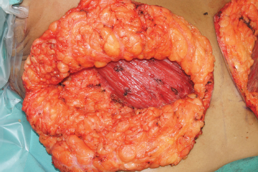 Finally, abdominal (ABD) pads and a surgical brassiere are placed. Care is taken to keep the brassiere snug but loose fitting. Compression could compromise the skin flap.