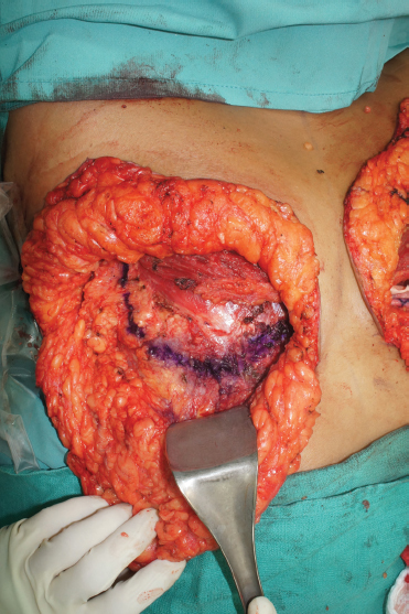 Prior to closure of the skin, the incisional edges are sharply debrided of 1–2 mm of divitalized skin that was traumatized by retraction during the mastectomy.