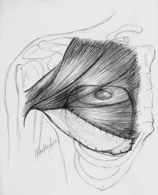 Incise the inferior margin of the pectoralis major off the ribs, making sure to leave a cuff of fascia at the inferior margin.