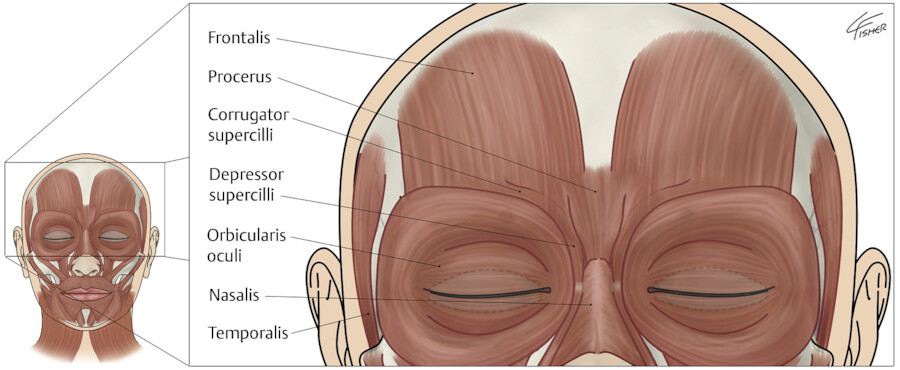 The glabellar complex comprises the medial brow depressors: procerus, corrugator supercilii, depressor supercilii, and the orbicularis oculi muscles. Understanding the depth of the glabellar musculature is important to treat those muscles needed for the desired effect while avoiding unnecessary paralysis of the frontalis. The procerus originates at the junction of the nasal bones, running superiorly, and inserts into the skin just above the glabella. Contraction of the procerus produces horizontal lines overlying the glabella.