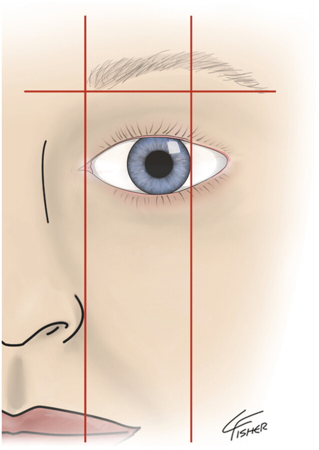 Before discussing the musculature of the upper-third of the face and injection techniques, it is important to understand the ideal positioning of the anatomic landmarks, especially the brow. The aesthetic importance of the brow has been highlighted for centuries. It is considered to be of primary importance in facial expression and beauty. The brows create a characteristic appearance to the face and are critical in expressing emotion. The shape and position of the brow also contributes to sexual dimorphism. The eyebrows form the superior aesthetic frame of the eyes. They can impart a range of emotions through the patient’s expression in addition to a youthful or aged appearance. The ideal shape of the brow begins with alignment of the brow head with the lateral nostril margin. The medial and lateral ends of the brow lie approximately at the same horizontal level. The apex of the brow lies on a vertical line directly above the lateral limbus (Fig. 7.2). The brow should lie at the orbital rim in males and be several millimeters above the rim in females. Over elevation creates an unnatural, surprised, or unintelligent look. Superior displacement of the medial brow can create an undesirable quizzical appearance. Furthermore, a low medial brow with a high lateral peak creates an angry look. 3 , 4