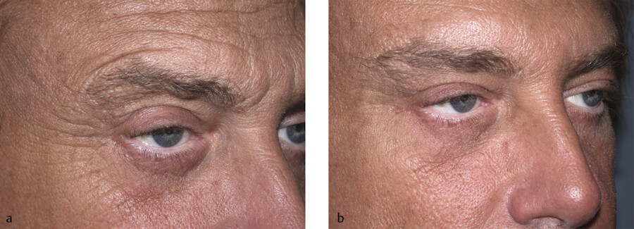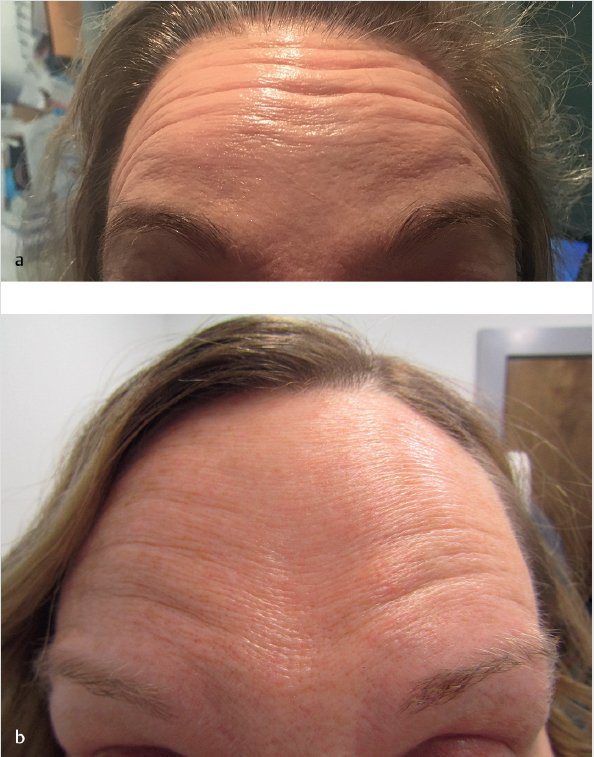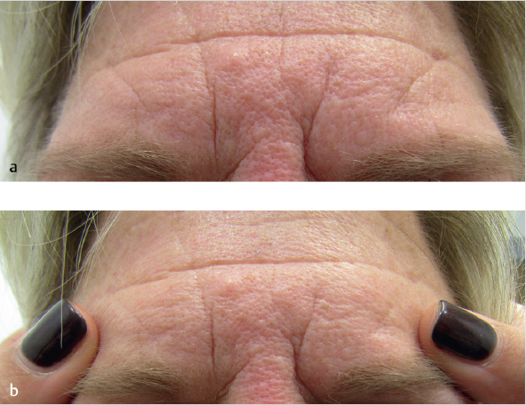 Patient selection and treatment parameters cannot be formulaic. Patients will have a difference in the anatomy of their frontalis, whether it is a continuous band (Fig. 7.3a) or if it has a midline dehiscence which is indicative of dual muscular components (Fig. 7.3b).