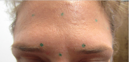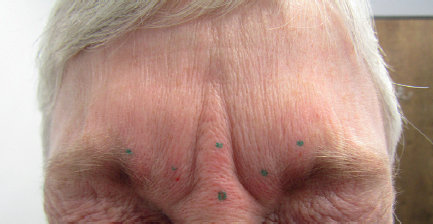 Suprabrow lateral forehead lines or commas are a source of cosmetic dissatisfaction for many patients. Inhibiting the muscle laterally especially in a patient with mild lateral brow ptosis can easily lead to an unsatisfying cosmetic outcome. One way to circumvent this problem is to use 1 to 2 U of neuromodulator reconstituted with 2 mL preservative saline. Draw it into a 31-gauge, 8-mm (5/16”) length 0.3 mL insulin syringe then add an additional 0.2 to 0.4 mL of preservative saline, resulting in a double dilution. This can then be injected in several small, equal aliquots over the lateral brow (Fig. 7.6). In addition, a low-viscosity filler can be used to treat the static aspect of these lines.