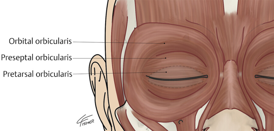 The next muscle to be discussed will be the pretarsal orbicularis oculi. The orbicularis oculi muscle is divided into pretarsal, preseptal, and orbital portions (Fig. 7.10). The pretarsal portion of the muscle lies on the tarsal plate. This muscle is responsible for maintaining the contact of the upper and lower ciliary margins of the eyelids with the globe. 9