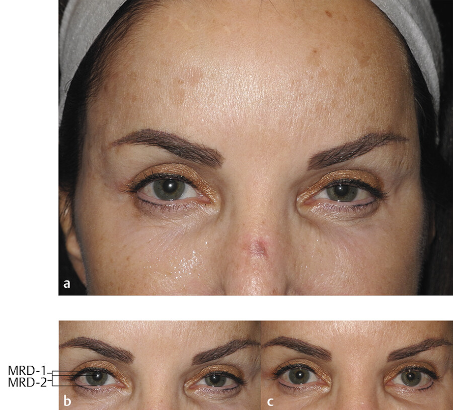 The orbital orbicularis oculi is responsible for the forceful closure of the palpebral fissure which is a conscious protective mechanism for the eye. In contrast, the pretarsal and preseptal portions are responsible for the natural blink reflex. The pretarsal portion is in intimate contact with the lower eyelid skin. It is the contraction of this muscle with smiling that creates several unappealing aesthetic facial features. The relative closure of the palpebral fissure can be seen in the before picture of this patient (Fig. 7.11a). This patient has a relative hypertonicity of her pretarsal orbicularis oculi of both the left upper and lower eyelid. The contraction of this muscle is creating ptosis to the upper eyelid and elevation of the lower lid. Therefore, the preinjection marginal reflex distance-1 (MRD-1) (the distance from the light reflex of the pupil and the upper ciliary margin) and MRD-2 (the distance of the light reflex of the pupil and the lower ciliary margin) are decreased (Fig. 7.11b). In this particular patient, a favorable result was achieved by injecting 0.5 U of onabotulinum to the upper eyelid pretarsal orbicularis oculi muscle medially and laterally and 2 U midpupillary in the lower pretarsal muscle (Fig. 7.11c). These injections involve subcutaneous placement with the tip of the needle just encroaching the surface of the skin of the upper eyelid. Placing tension on the upper eyelid skin and applying gentle traction with the noninjecting hand with the patient looking downward allows for a safe and accurate injection.