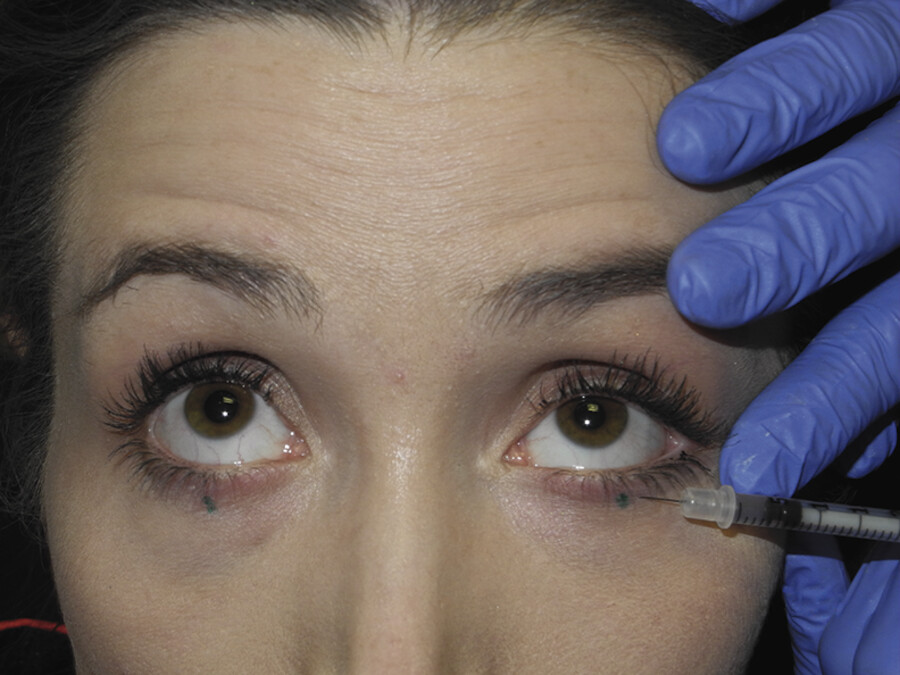 The injection of the crow’s feet occurs at or lateral to the orbital rim. Bright light along with tensing the skin helps to identify periorbital veins, thus avoiding bruising. A 0.3-mL, 5/16” 31-gauge needle should be used, and injection is performed by directing the needle away from the globe and creating a small wheal either intradermal or immediately subcutaneous. The medial injections involved with treatment of the crow’s feet should not extend more medial than the extent of the orbital rim. Injections placed medial to this critical anatomic landmark can result in diplopia and/or strabismus from paralysis of the lateral rectus muscle. Treatment of the crow’s feet typically requires 6 to 12 U of onabotulinum or incobotulinum, or 18 to 36 U of abobotulinum (per side) are injected evenly in three to four sites within the muscle. 8