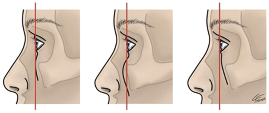 It is important for one to evaluate the patient’s vector of the midface when contemplating an inferior pretarsal orbicularis oculi injection. The patient with a negative vector is defined as a line drawn perpendicular from the cornea and extending inferiorly and falling anterior to the malar eminence. These patients may experience an increase in the MRD-2 with injection of this muscle, creating a lid retraction. Normal and positive vector patients should tolerate this injection well (Fig. 7.13). The last situation to consider for injection of the jellyroll is the preexistence of scleral show (increase in MRD-2 on preinjection photographs on normal gaze). These patients may be prone to worsening of this condition with this injection.