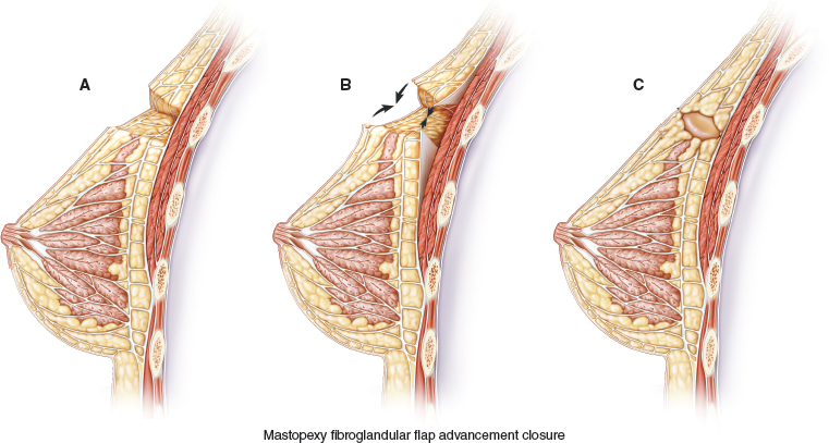 A full-thickness tissue resection is completed (A). The fibroglandular tissue is elevated off the chest wall in preparation for mastopexy closure (B). The flap is advanced and breast tissue is closed at the chest wall, and final skin closure is performed, leaving a small cavity for transient seroma formation that will resolve during radiation therapy (C).