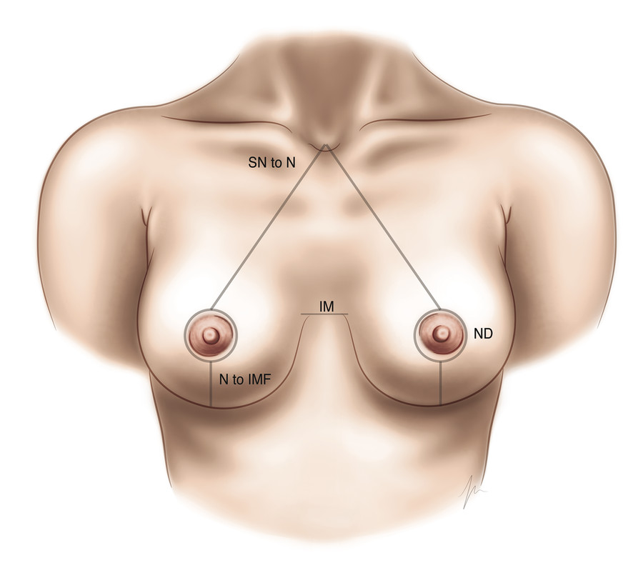 Specific measurements (suprasternal notch–to-nipple distance, breast base width, nipple-to-IMF distance, nipple-to-midline distance)