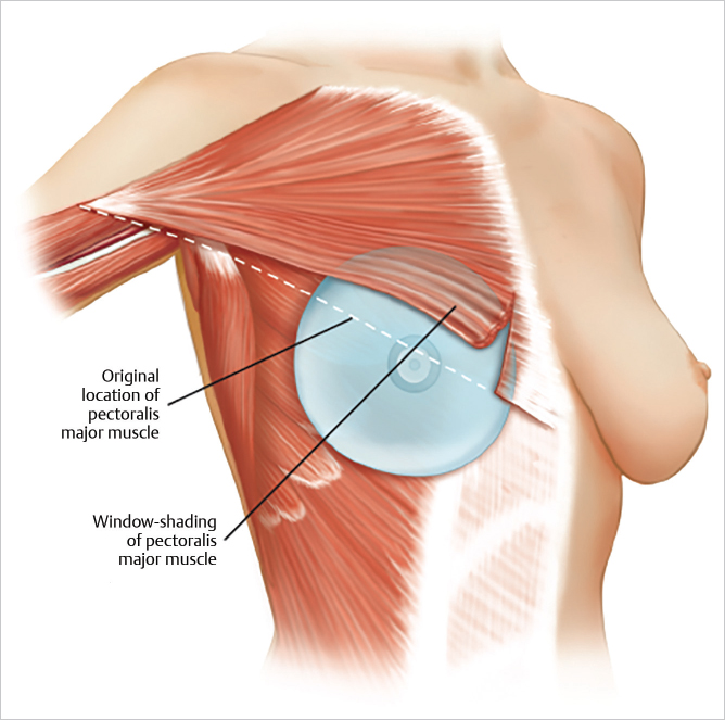 When a surgeon uses the dual-plane approach, releasing the pectoralis major muscle inferiorly can result in cephalad rotation of the muscle, or window shading. This may result in displacement of the device inferiorly and laterally as well as thinning of lower pole skin. To avoid these complications, Spear and colleagues described the use of marionette sutures to control the position of the pectoralis muscle early in the postoperative phase to prevent window shading. However, inferior and lateral device migration and thinning of lower pole skin continued to be potential complications.