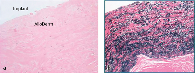 The long-term persistence of AlloDerm-derived tissue is shown at 2.5 and 5 years in the lower medial pole of the breast (▶Fig. 7.2). The distinct difference between this regenerated tissue and that of native breast capsule from the upper pole of the same breast is clearly seen. The matrix–implant interface is shown of a hematoxylin and eosin stain of AlloDerm placed in the inferomedial pole of the breast to revise implant position. In a Verhoeff–Van Gieson stain for elastin, the black bands indicate elastin from the matrix tissue placed 2.5 years before this biopsy. The elastin-negative tissue is scar tissue between the matrix and the skin of the breast. The high elastin content of the AlloDerm capsule may help to explain an emerging trend that suggests that these matrices may reduce capsular contracture around expanders and implants following immediate breast reconstruction.