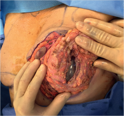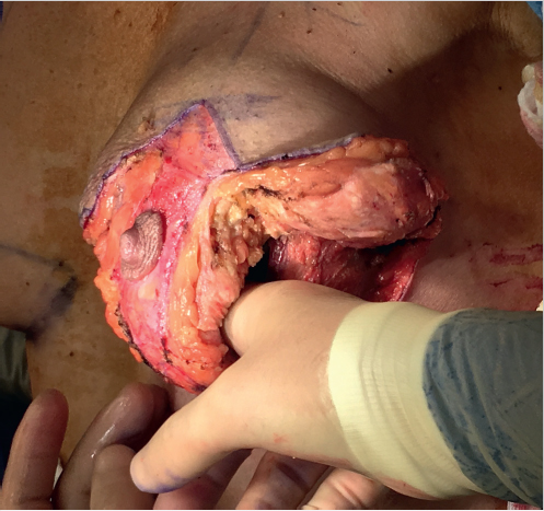 Elevate 2-cm thick medial and lateral breast skin flaps (Fig. 70.1). Limit dissection above the level of the areola.
