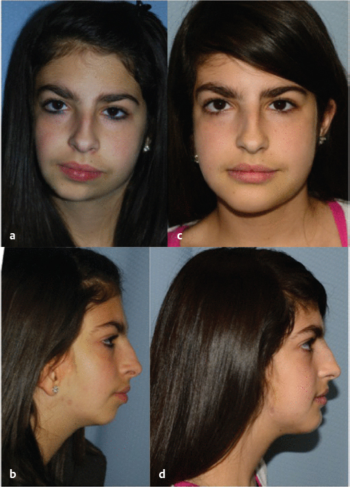 Fig. 71.3 Before (a,b) and after (c,d) for a patient with hemifacial microsomia who has underwent osseus genioplasty and fat grafting.