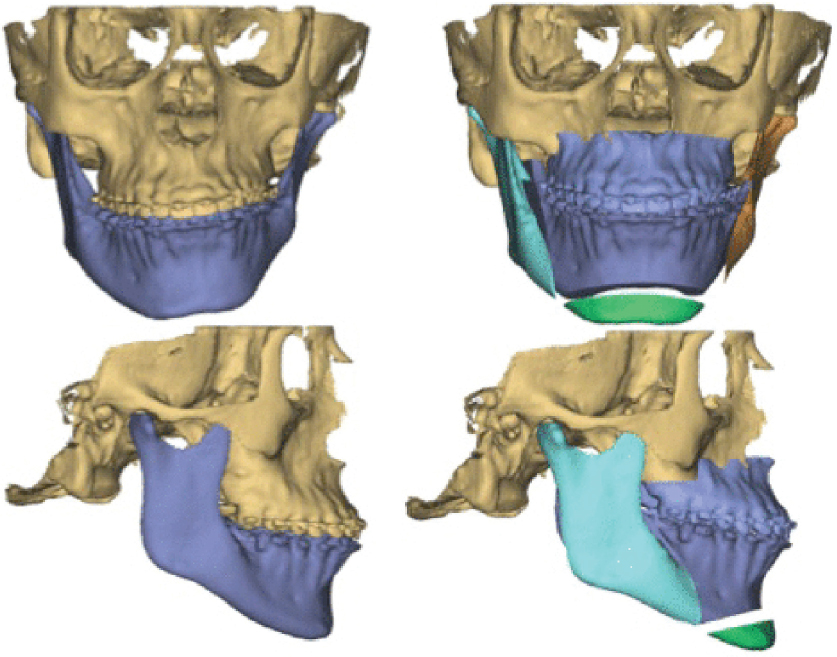 Fig. 71.6 Preoperative threedimensional planning for orthognathic surgery to correct maxillomandibular deficiencies and asymmetry in hemifacial microsomia. The maxilla is advanced and lengthened on the affected left side and impacted on the unaffected side. The mandible moves to boot following bilateral sagittal split osteotomies. Finally, an osseous genioplasty is performed to lengthen and further centralize the chin.
