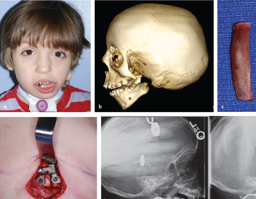 Fig. 71.7 (a) A patient with hemifacial microsomia with a type III mandibular deformity on the left and IIA on the right. Note tracheostomy dependence from sagittal mandibular deficiency. Patient underwent proximal mandibular reconstruction on the type III side with a costochondral graft as well as sagittal lengthening using curvilinear distraction osteogenesis. (b) Preoperative computed tomography scan demonstrating absence of temporomandibular joint (including lack of proximal ramus, condyle, and glenoid fossa). (c) Intraoperative photograph of costochondral graft. (d) Intraoperative photograph of distraction device and corticotomy. (e) Immediately after distractors placed and during consolidation.