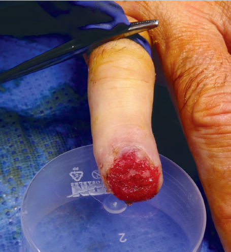 Fig. 72.1 Dorsal oblique amputation of fingertip with exposed bone. (Reproduced with permission from Dariush Nikkhah. Hand Trauma: Illustrated Surgical Guide of Core Procedures, 1st edition © 2017 Thieme.)