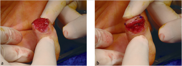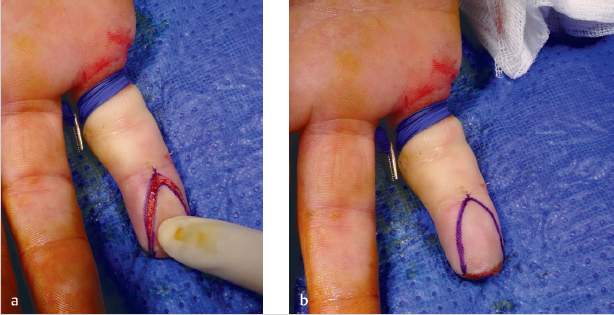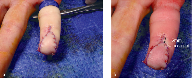 Fig. 72.4 (a,b) Sufficient advancement achieved to provide a well-padded tip. (Reproduced with permission from Dariush Nikkhah. Hand Trauma: Illustrated Surgical Guide of Core Procedures, 1st edition © 2017 Thieme.)