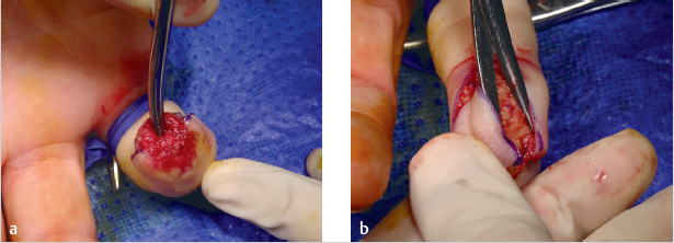 Fig. 72.2 (a) Incision of the skin under digital tourniquet. (b) Curvilinear markings, the flap width should be the width of the nailbed. (Reproduced with permission from Dariush Nikkhah. Hand Trauma: Illustrated Surgical Guide of Core Procedures, 1st edition © 2017 Thieme.)