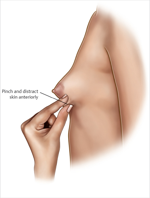 Fig. 73.1 Anterior distraction of inframammary fold (IMF) tests the degree of lower breast pole constriction. The skin overlying the IMF is pinched and distracted anteriorly. Patients with a mobile IMF (mild constriction) may be candidate for a one-stage procedure, while a patient whose IMF is fixed (moderate–severe constriction) will need a two-stage approach: tissue expansion, followed by implant placement.