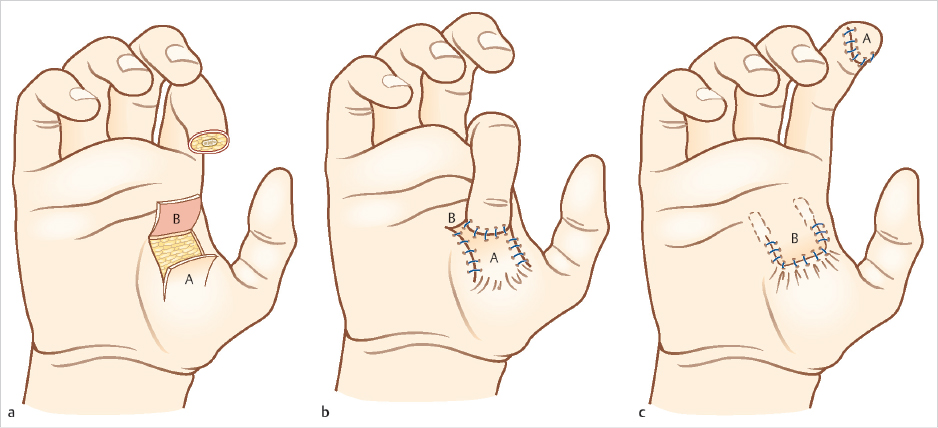 The thenar flap was first described by Gatewood 6 in 1926 and modified by Flatt in 1957 as a two-stage, proximally based transfer flap from the medial aspect of the thenar eminence. 5 (► Fig. 75.1). Depending on the clinical situation, several modifications exist including pedicle source of flap, location on thenar eminence, and flap base positioning all with excellent outcomes. 5 , 7 , 8 , 9 The thenar flap is ideally suited for volar skin and pulp avulsions of the terminal phalanx of the index, long, and ring fingers, with a majority of nail and bone intact. 1 For volar oblique soft tissue injuries too extensive for healing by secondary intention, primary closure, or V-Y advancement, the thenar flap provides restoration of pulp contour and bulk, soft tissue color and texture match, and recovery of functional sensibility. 7