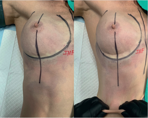 Breast markings must be adjusted to account for inferior IMF displacement and should be made while the abdomen skin is “on-stretch.”