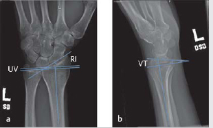 Medoff published average radiographic parameters of the distal radius from a sample size of 40, including radial inclination (23.6 degrees), radial height (11.6 degrees), and volar tilt (11.2 degrees). 8 The normal radiographic parameters of the distal radius are shown in ► Fig. 8.1 (normal wrist X-ray with overlying parameters).