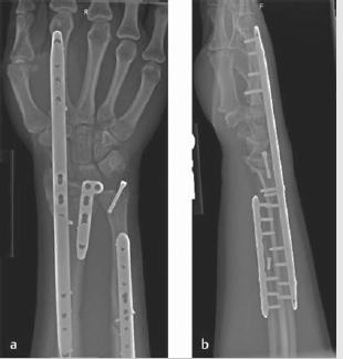 Although the original technique involved using a 3.5-mm plate on the floor of the 4th dorsal compartment to the 3rd metacarpal, 17 Hanel et al published a modification using either a Synthes 2.4 mm distal radius bridge plate or mandibular reconstruction plate through the 2nd dorsal compartment to the 2nd metacarpal (► Fig. 8.2). 16