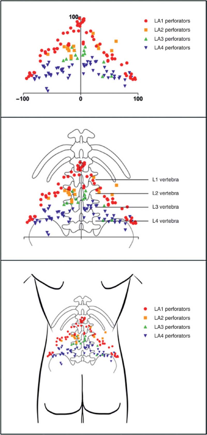 Fig. 8.3 Topographical distribution of the different lumbar perforators as they pierce the skin.