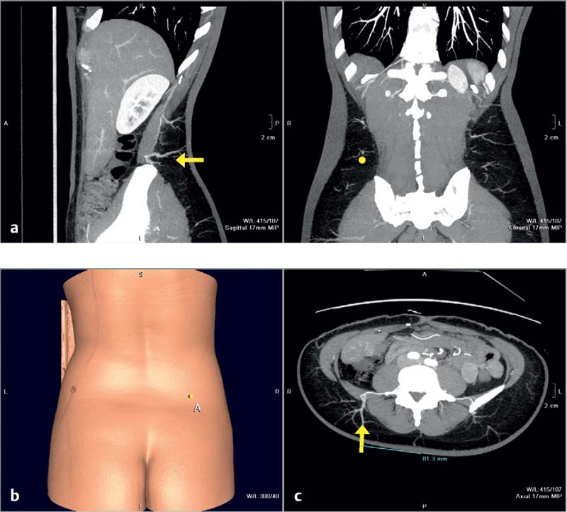Before surgery, the size, position, and course of the lumbar perforators is checked on a preoperative computed tomography (CT) or MRA scan. The patient should be positioned face down for the scan, so that the gluteal/lumbar perforators are not compresses. The X-axis is provided either by a horizontal radiopaque marker or by the height of the iliac crest ( Fig. 8.4 ). The lowermost lumbar perforator (L4), crossing the posterior iliac crest, is usually preferred to enable positioning of the scar as low as possible.