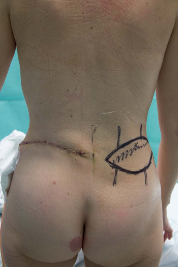 With the patient in standing position, the skin island is marked as needed on top of the posterior iliac crest, pinching the posterior “love handles.” The skin island is marked as low as possible above the gluteal prominence, slightly slanting upward from medial to lateral, mimicking the skin excision of a posterior buttock lift; however, care should be taken not to cross the posterior midline. In a primary breast reconstruction, the skin island should be kept as small as possible to avoid problems with donor-site closure; skin islands of 8 to 10 cm can be fairly easily closed. Vertical marks enable perfect closure of the donor site ( Fig. 8.5 ). If a bilateral procedure is planned, the opposite side is marked symmetrically and covered with an OpsiteR (Smith & Nephew, Andover, MA) dressing to save the drawings until the second intervention ( Fig. 8.6 ).