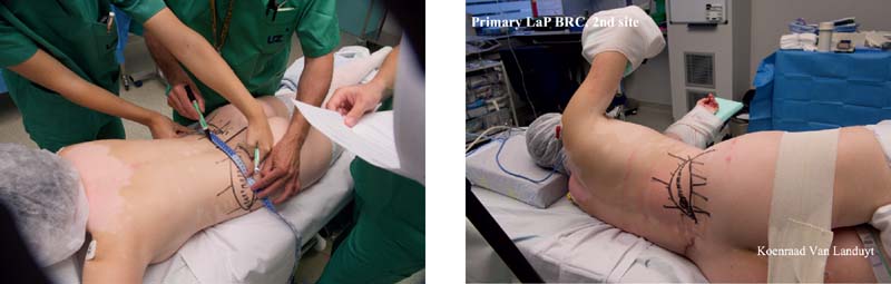 As the LAP flap donor site is prone to seroma formation, careful closure of the donor site is mandatory. To obtain a buttock lift effect, undermining is continued but only inferiorly on top of the buttock musculature. If feasible, the gap in the thoracolumbar fascia is closed with interrupted resorbable sutures. The region around the iliac crest is injected subfascially with a long-acting local anesthetic to reduce postoperative pain. Two drains are left in place, tacking sutures are applied, and the wound edges are carefully approximated, following the preoperative vertical markings. Prior to closure, the wound is rinsed with an antibiotic solution.