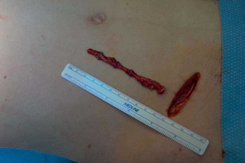 If a vascular graft is deemed necessary, the inferior epigastric vessels are approached through a small inguinal incision. The distal part of the epigastric pedicle is dissected over a length of 5 to 6 cm, from the exit point out of the rectus abdominis muscle, up to the collateral venous confluence; it is harvested and flushed with heparinized physiological solution ( Fig. 8.10 ).