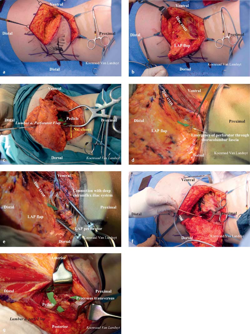 Fig. 8.11 (a,b) Initial dissection of the LAP flap, from lateral superior to medial inferior, toward the surgeon. (c) The course of the cluneal nerves. (d) The emergence of the lumbar perforator through the thoracolumbar fascia. (e) Dissection underneath the thoracolumbar fascia showing the connection with the deep circumflex iliac system. (f) Blunt freeing of the pedicle aided by the use of a cotton tip. (g) The length of the pedicle up to the processus transversus.