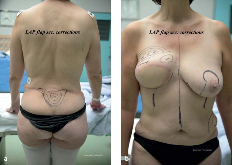 Secondary corrections are performed 3 to 6 months after the initial surgery including the usual nipple reconstruction, symmetrization of the breasts, and scar corrections. As to the donor site, symmetrization is also performed at this time by liposuction/lipofilling if necessary ( Fig. 8.17 ).