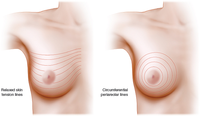 The breast incisions should be planned with the patient in the upright position in the event that a mastectomy is needed. Relaxed skin tension lines (RSTL) of the breast follow the natural wrinkle lines. Incisions within these lines generally produce the best cosmetic results. Incisions configured as concentric circles radiating from the central NAC have been advocated by many breast surgeons. These incisions are frequently perpendicular to the relaxed skin tension lines and can be disfiguring, especially in the medial quadrant of the breast.