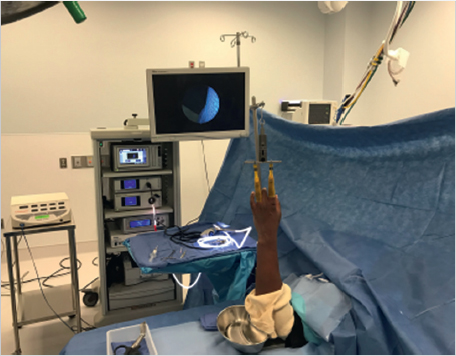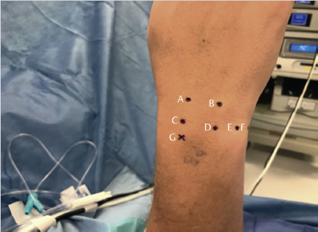 Most arthroscopic procedures are performed through dorsal portals in relation to the extensor compartments. Because of their remoteness from the radial artery and radial nerve branches, the 3–4 and 4–5 portals are considered the safest. 1 , 2 The superficial branch of the radial nerve and radial artery are found to be on average 16 mm and 26 mm, respectively, from the 3–4 portal. As such, these portals are established first. The greatest risk of neurovascular injury is in creation of the 1–2 portal. Here, the superficial radial nerve and radial artery both pass within 3 mm of the portal. The dorsal sensory branch of the ulnar nerve is found 4.5 mm from the 6 U portal and 8.3 mm from the 6 R portal. 1 Volar portals are less commonly used because of greater dissection and neurovascular risks but they provide visualization of the dorsal capsule and volar interosseous ligaments as needed. Finally, avoid thermal injury by using short pulses of the radiofrequency cautery rather than prolonged use. A small joint arthroscope (1.9 or 2.7 mm) is typically used.