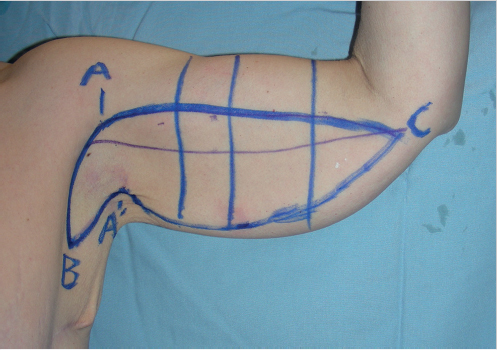 The margins of the superior incision line are marked by placing caudal traction on the arm, with the proximal end (point A) set high in the dome of the axilla.