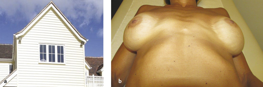 Examine the patient’s skeletal framework and look for scoliosis and other skeletal abnormalities: pectus deformities, prominent ribs, or a downward and laterally sloping chest wall. All skeletal abnormalities and asymmetries can and will be exaggerated postoperatively following implant placement. Excess lateralization of implants is frequently a consequence of a common chest wall variant, which we refer to as a sloping chest wall. In this variant, the sternum is the peak of the “roof,” and the laterally sloping ribcage does not provide a level platform to support the implant (Fig. 9‑3). These skeletal asymmetries cannot be emphasized enough. Patients are often unaware of them and do not comprehend the challenges that their unique anatomy presents and cannot be overcome. 7