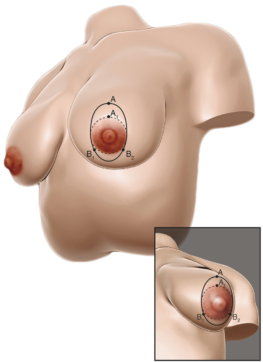 Circumareolar mastopexy is best employed in patients who have good skin quality and minimal glandular ptosis/pseudoptosis and require minimal nipple areolar elevation. The planned elevation should be 1.5–2 centimeters or less. 11 The patient is marked in a standing position, placing the nipple 1–2 cm above the IMF.