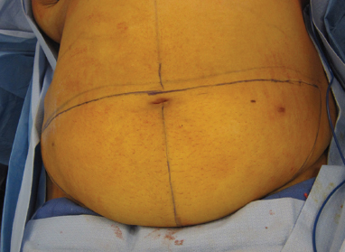 With the patient standing, the abdominal midline is delineated from the xiphoid process to the pubic bone. The anterior superior iliac spine (ASIS) is palpated and delineated bilaterally. The proposed upper border of the flap is delineated. This definitive line is marked at the level just above the umbilicus. The inferior extent of the flap is marked via a curvilinear line extending from the ASIS toward the pubic symphysis. This line is tentative and is not definitively decided on until the patient is in the operating room (Figure 9.1).