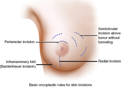 The need for skin resection generally depends on the possible connection between the tumor and the dermis, especially tumors located superficially in the gland. When the tumor is deeper within the glandular tissue, an inframammary incision works well.